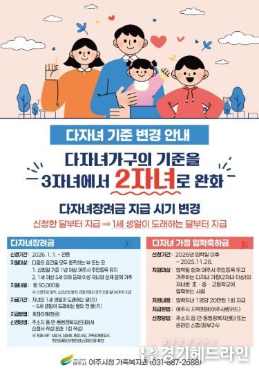 [경기헤드라인=정현수 기자] 여주시는 저출산 극복과 양육 부담 완화를 위해 '여주시 출산장려 및 다자녀 가정 양육 지원에 관한 조례'를 개정하여 다자녀 기준을 변경한다고 밝혔다.