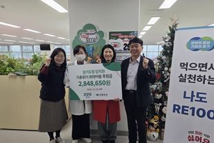 [경기헤드라인=문수철 기자] 경기도는 24일 경기도청에서 ‘도전! 잔반 제로!’ 캠페인으로 적립한 기부금 284만 8,650원을 초록우산어린이재단에 전달했다.