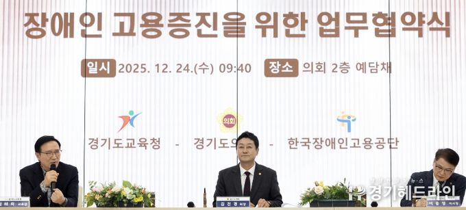 [경기헤드라인=문수철 기자] 경기도교육청이 24일 경기도의회 예담채에서 경기도의회(의장 김진경), 한국장애인고용공단(이사장 이종성)과 함께 장애인 고용증진을 위한 업무협약을 체결했다.