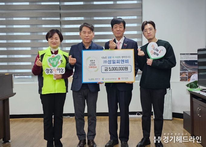 [경기헤드라인=문수철 기자] 남양주시는 지난 23일 오남읍사무소에서 ㈜성일씨앤비가 연말을 맞아 오남읍 취약계층 지원을 위해 후원금 500만 원을 남양주시복지재단에 기부했다고 밝혔다.