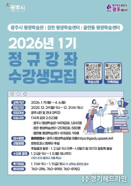 [경기헤드라인=정현수 기자] 광주시는 12월 29일부터 31일까지 평생학습관, 검천평생학습센터 및 읍면동 평생학습센터에서 운영하는 2026년 제1기 평생학습 프로그램 수강생을 모집한다고 26일 밝혔다.