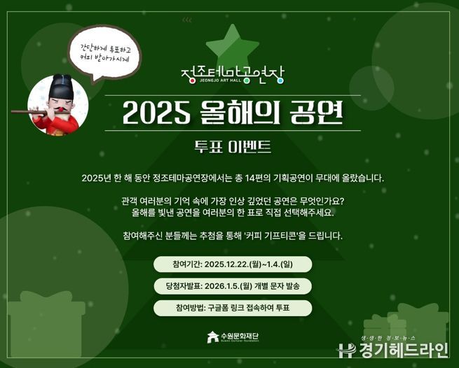 수원문화재단은 2026년 1월 4일까지 ‘2025 정조테마공연장 올해의 공연’ 관객 투표 이벤트를 진행한다.