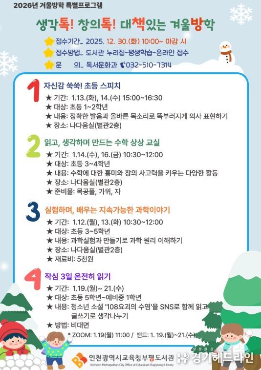 [경기헤드라인=문수철 기자] 인천광역시교육청부평도서관은 겨울방학을 맞아 1월 한달간 새 학년을 준비하는 초등학생과 중학생을 대상으로 겨울방학 특별프로그램을 운영한다.
