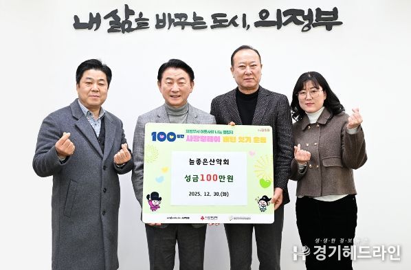 [경기헤드라인=문수철 기자] 의정부시는 12월 30일 늘좋은산악회가 ‘100일간 사랑릴레이 배턴 잇기’에 동참해 관내 저소득층을 위한 성금 100만 원을 기부했다고 밝혔다.