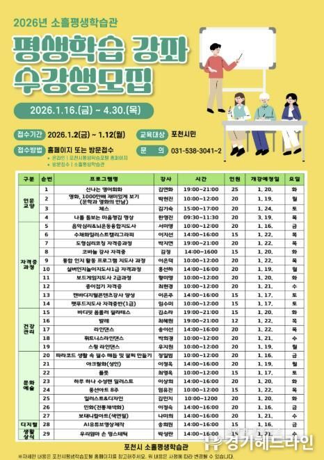 [경기헤드라인=김홍량 기자] 포천시는 오는 12일까지 소흘평생학습관에서 운영하는 2026년 1기 정규 평생학습 프로그램 수강생을 모집한다.