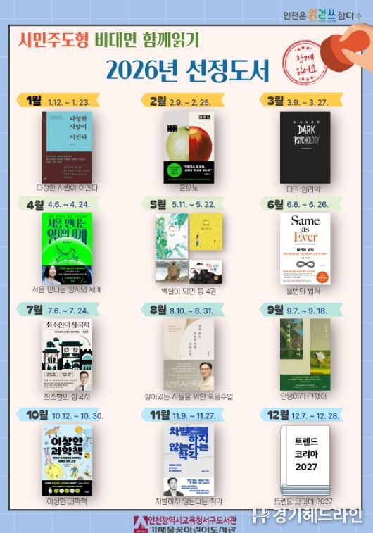 [경기헤드라인=문수철 기자] 인천광역시교육청서구도서관은 12월 31일 ‘2026년 시민주도형 비대면 함께읽기’ 도서 15권을 선정·발표했다.