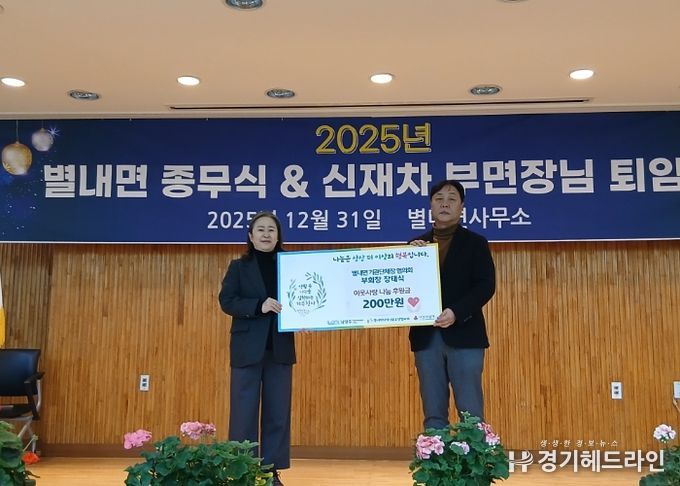 [경기헤드라인=문수철 기자] 남양주시는 지난달 31일 열린 ‘2025년 별내면 종무식’에서 별내면 기관단체장협의회가 지역 내 취약가구 지원을 위해 후원금 200만 원을 별내면 지역사회보장협의체에 기탁했다고 2일 밝혔다.