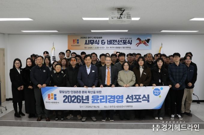 [경기헤드라인=김홍량 기자] 파주도시관광공사는 지난 1월 2일 본청 대회의실에서 ‘2026년 윤리경영 선포식’을 개최하여 청렴과 인권을 기반으로 한 윤리경영 실천 의지를 대내외에 공식 선언했다.