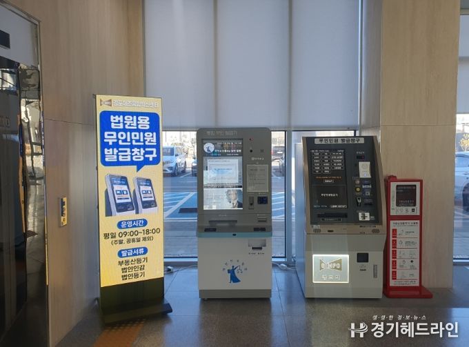 대법원 통합무인민원발급기는 ▲법인인감증명서 ▲법인등기사항증명서 ▲부동산등기사항증명서 등 법원 관련 민원서류 3종을 즉시 발급할 수 있는 기기로, 발급 수수료는 1통당 1,000원이며 운영시간은 평일 오전 9시부터 오후 6시까지다.