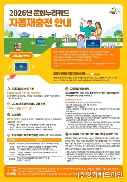 [경기헤드라인=문수철 기자] 인천문화재단은 2026년 1월 16일부터 1월 21일까지 문화누리카드 지원금이 자동으로 재충전된다고 밝혔다.