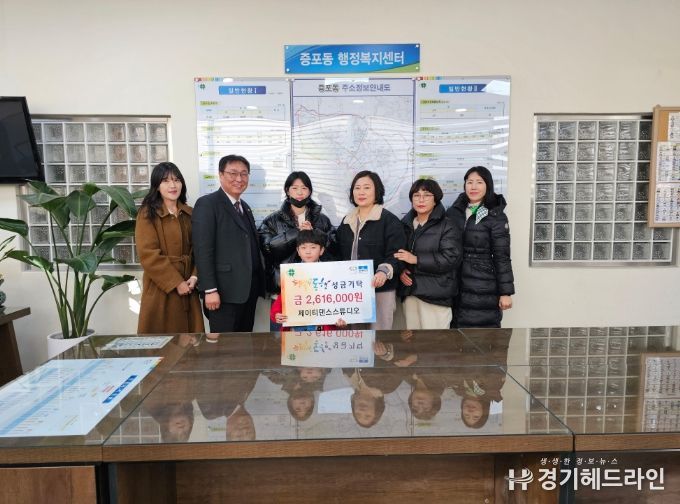 [경기헤드라인=정현수 기자] 이천시 증포동은 1월 8일, 제이티댄스스튜디오가 증포동행정복지센터를 찾아 관내 취약계층 아동 지원을 위한 기탁금 2,616,000원을 전달했다고 밝혔다.