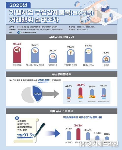 특히, 구입이 강제되는 품목 중 91.3%는 시중에서도 구입이 가능한 것으로 확인되어, 가맹본부의 구입강제품목 지정에 대한 탄력성 제고가 필요한 것으로 분석됐습니다.
