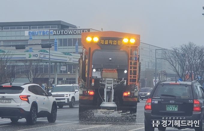 [경기헤드라인=문수철 기자] 수원시가 10일 선제적으로 제설제를 살포해 블랙아이스(도로결빙)에 대비했다.
