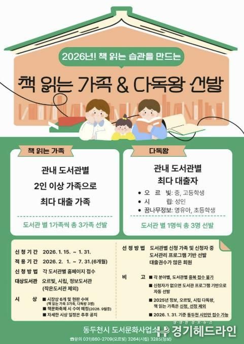 [경기헤드라인=김윤종 기자] 동두천시 도서문화사업소는 오는 1월 15일부터 31일까지 관내 시민을 대상으로 ‘책 읽는 가족’과 ‘다독왕’ 선발을 위한 참여자 신청을 받는다.