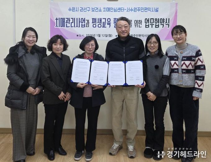 [경기헤드라인=문수철 기자] 수원시 권선구보건소 치매안심센터와 서수원주민편익시설은 12일 서수원주민편익시설 강의실에서 치매관리사업과 평생교육 활성화를 위한 업무협약을 체결했다.