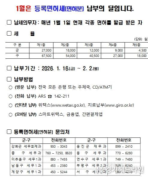 [경기헤드라인=문수철 기자] 인천광역시는 2026년 정기분 등록면허세(면허분) 396,262건, 총128억 원을 부과·고지했다고 밝혔다.