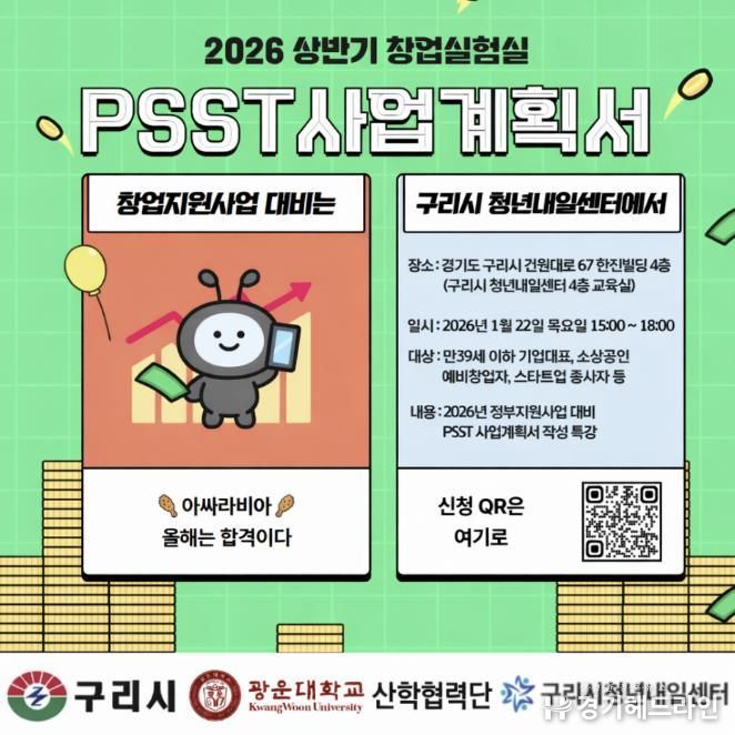 이번 프로그램은 2026년 대형 정부 창업지원 사업을 대비한 PSST 전략 사업계획서 작성 특강으로, 실질적인 창업 역량 강화를 목표로 기획됐다. 특강은 1월 22일(목) 오후 3시부터 6시까지 운영되며, 관내 청년 예비창업가와 기업 대표, 소상공인 등을 대상으로 사업계획서 작성 비법과 맞춤형 조언을 중심으로 한 실전형 교육으로 진행될 예정이다.