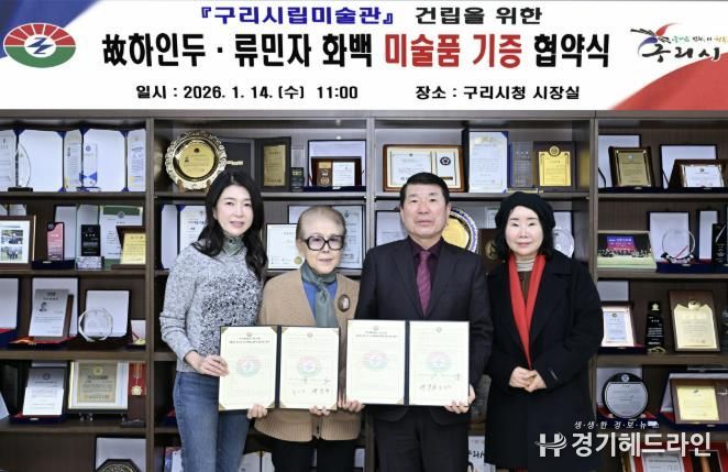 [경기헤드라인=문수철 기자] 구리시는 지난 14일 시청 3층 시장실에서 ‘구리시립미술관 건립을 위한 작품 기증 협약식’을 개최했다. 이번 협약식은 한국 현대미술사의 거장 고(故) 하인두 화백의 작품 80점과 류민자 화백의 작품 25점을 기증받고, 문화예술 교류 협력을 공식화하기 위해 마련됐다.