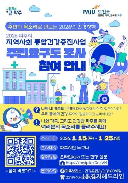 [경기헤드라인=김홍량 기자] 파주시는 시민의 건강한 삶을 지원하기 위해 '2026년 지역사회 통합건강증진사업’추진에 앞서 주민건강요구도 조사를 실시한다.