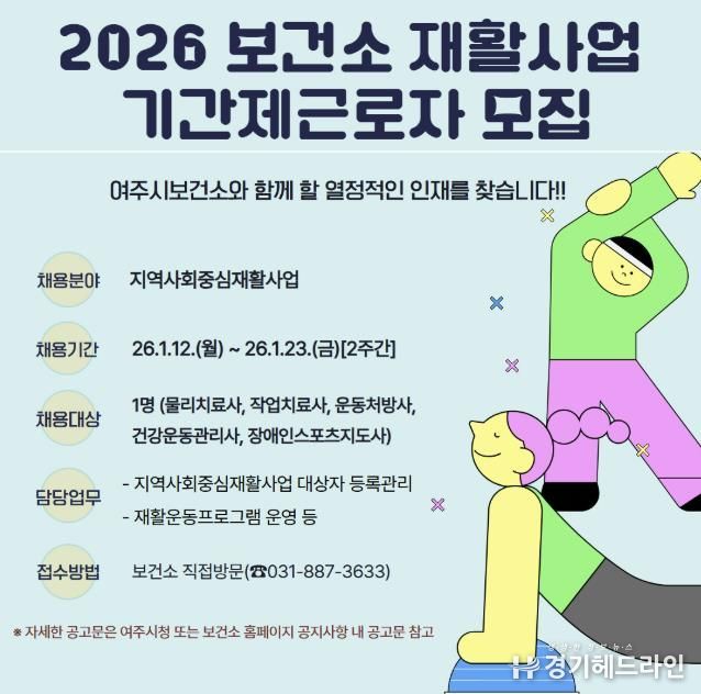[경기헤드라인=정현수 기자] 여주시보건소는 지역 내 등록장애인과 예비장애인들의 건강관리를 위한 지역사회중심재활사업 추진을 위해 1월 12일부터 1월 23일까지 2주간 기간제근로자 채용 공고를 실시한다.
