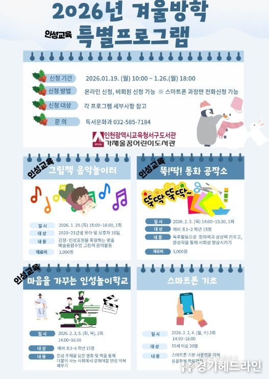 [경기헤드라인=문수철 기자] 인천광역시교육청서구도서관은 ‘2026년 겨울방학 특별프로그램’ 학습자를 19일 오전 10시부터 선착순으로 모집한다.