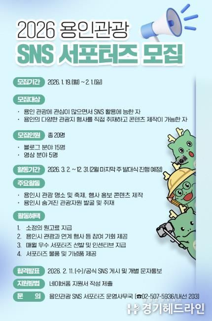 [경기헤드라인=문수철 기자] 용인특례시는 2월 1일까지 용인의 관광자원과 다채로운 축제·행사를 시민의 시각에서 생동감 있게 홍보할 ‘용인관광 SNS 서포터즈’를 모집한다고 20일 밝혔다.