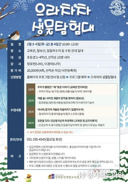 [경기헤드라인=문수철 기자] 칠보생태환경체험교육관이 겨울방학 프로그램 ‘으라차차 생물탐험대(겨울 탐조프로젝트)’에 참여할 초등학교 1~4학년 어린이 15명을 선착순으로 모집한다.