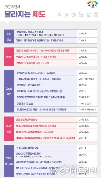 [경기헤드라인=정현수 기자] 이천시가 2026년 새해를 맞아 시민 생활과 밀접한 달라지는 제도를 발표했다.
