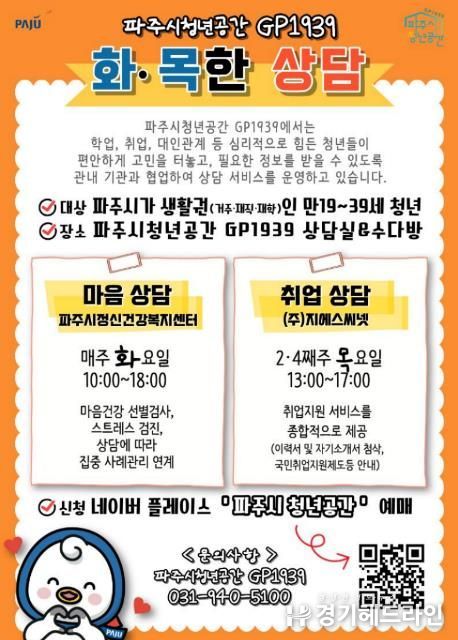 [경기헤드라인=김홍량 기자] 파주시는 청년들의 심리 안정과 취업 역량 강화를 위해 파주시청년공간 지피(GP)1939에서 진행하는 상담 프로그램 ‘화·목한 상담’의 참여자를 모집한다.