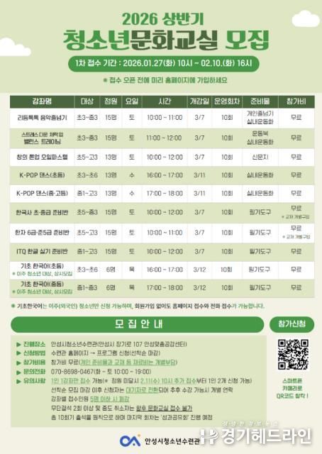 [경기헤드라인=문수철 기자] 안성시청소년수련관이 지역 청소년들의 건강한 여가 선용과 자기계발을 위해 1월 27일부터 2월 10일까지 ‘청소년 문화교실’ 수강생을 모집한다.