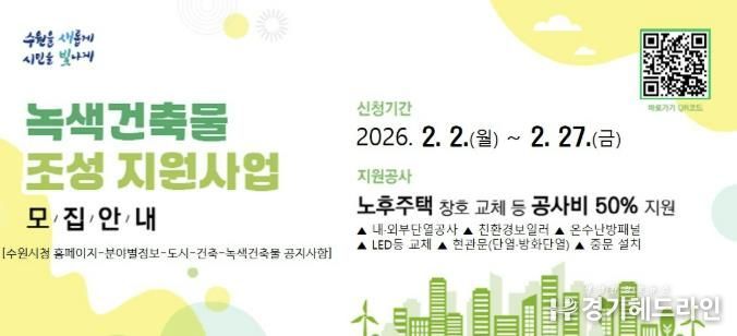 [경기헤드라인=문수철 기자] 수원특례시가 2월 2일부터 27일까지 ‘2026년 녹색건축물 조성 지원사업’ 신청을 받는다.