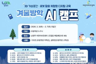 시 관계자는 “이번 겨울방학 AI 캠프는 방학 기간 중 발생할 수 있는 교육 공백을 해소하고, 초등학생에게 미래 사회에 필요한 핵심 디지털 역량을 체계적으로 제공하기 위한 프로그램”이라며 “앞으로 AI·디지털 분야 체험 및 교육을 지속적으로 확대해 나가겠다”고 전했다.