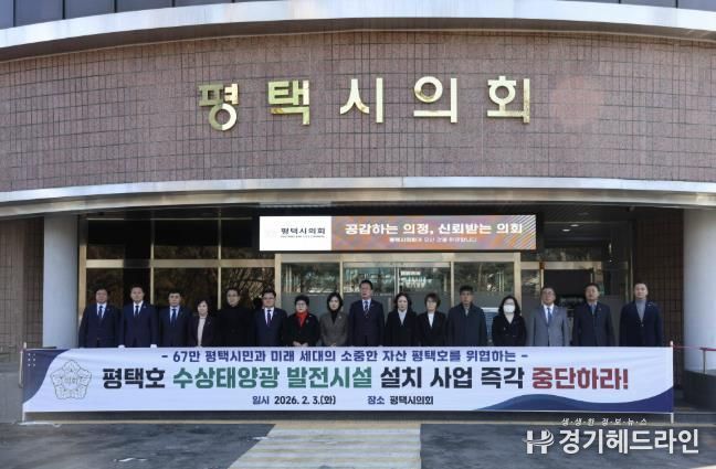 [경기헤드라인=문수철 기자] 평택시의회는 2월 3일, 시의회 본관 앞에서‘평택호 수상태양광 발전시설 설치 중단 촉구 성명서’를 발표했다.