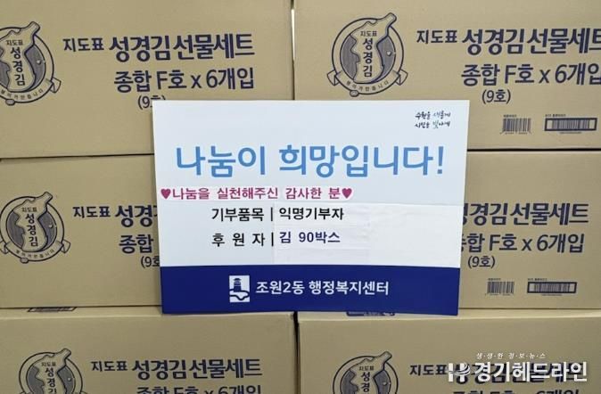 [경기헤드라인=문수철 기자] 수원시 장안구 조원2동은 지난 3일, 설 명절을 맞아 익명의 기부자가 김 81박스를 기탁해 지역사회에 따뜻한 온정을 전했다고 밝혔다.