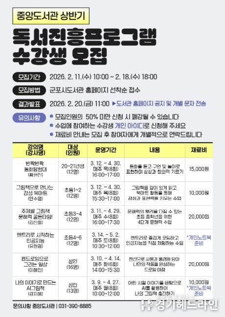 [경기헤드라인=문수철 기자] 군포시 중앙도서관은 다가오는 3월 시민들의 독서역량 개발과 지속적인 독서활동을 고취하기 위해 상반기 독서진흥프로그램을 운영한다.