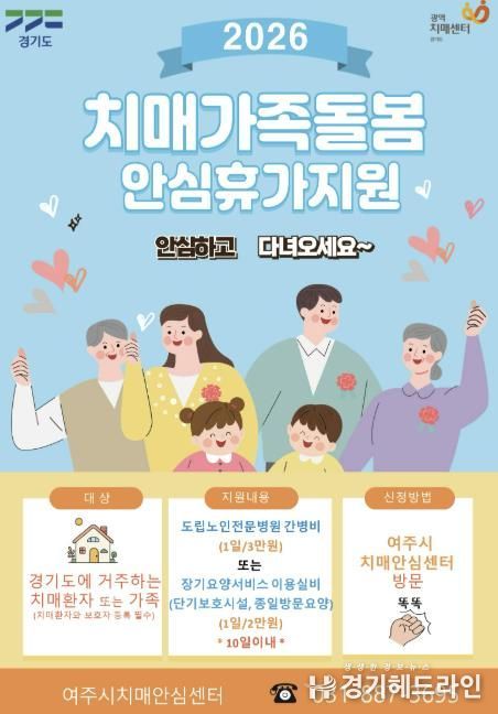 [경기헤드라인=정현수 기자] 여주시치매안심센터는 2026년에도 치매환자를 돌보는 가족이 잠시나마 돌봄에서 벗어나 휴식을 취할 수 있도록『치매가족돌봄 안심휴가제』를 지속적으로 운영한다.