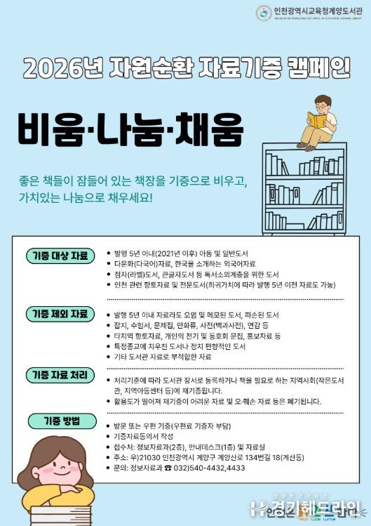 [경기헤드라인=문수철 기자] 인천광역시교육청계양도서관은 시민과 지역사회가 함께하는 자원순환형 독서문화 확산을 위해 2026년 자료기증 캠페인 ‘비움·나눔·채움’을 연중 운영한다고 5일 밝혔다.