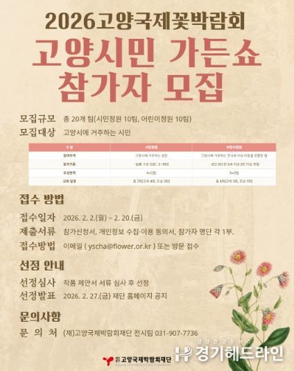 [경기헤드라인=김홍량 기자] (재)고양국제박람회재단이 오는 4월 24일 일산호수공원에서 개최되는 2026고양국제꽃박람회의 시민 참여 프로그램 ‘고양시민 가든쇼’의 참가자를 이달 20일까지 모집한다.