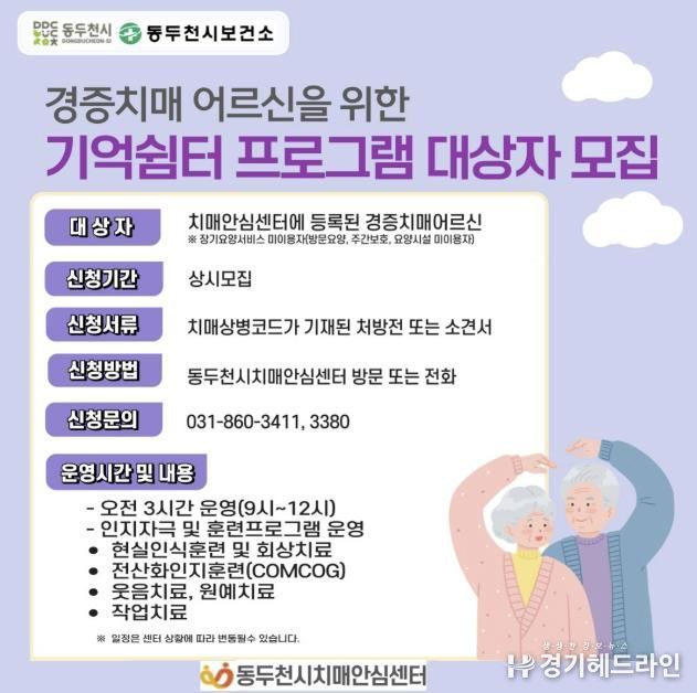[경기헤드라인=김윤종 기자] 동두천시치매안심센터는 경증 치매 환자를 대상으로 ‘기억쉼터 프로그램’ 1기 참여자를 모집한다고 밝혔다. 프로그램은 2026년 3월 9일부터 5월 12일까지 운영된다.