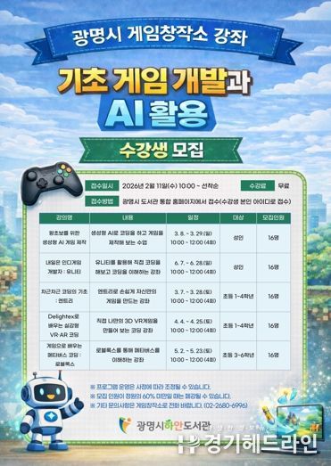 [경기헤드라인=문수철 기자] 광명시 게임창작소는 오는 11일 오전 10시부터 상반기 시민 교육 프로그램인 ‘기초 게임 개발과 인공지능(AI) 활용’ 강좌의 수강생을 모집한다.