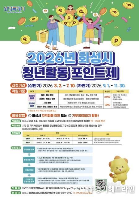 [경기헤드라인=문수철 기자] 화성특례시는 청년의 시정 참여와 지역사회 활동을 지원하기 위해 오는 3월 2일부터‘2026년 청년활동포인트제’를 본격 시행한다.