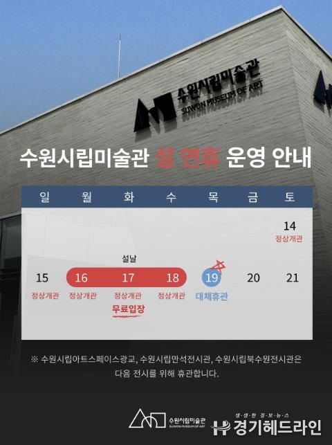 수원시립미술관 행궁 본관은 설 연휴 기간인 2월 15일부터 18일까지 정상 개방하며 설 당일인 2월 17일에는 무료 관람을 실시하며, 2월 19일에 대체 휴관한다.