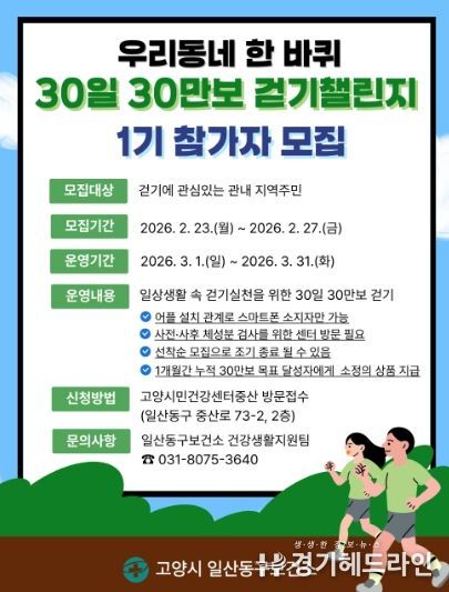 [경기헤드라인=김홍량 기자] 고양특례시 일산동구보건소는 지역 주민의 기초 체력 증진과 신체활동 활성화를 위해 기획한‘우리동네 한 바퀴 30일 30만보 걷기 챌린지’1기 참가자를 오는 23일부터 모집한다.