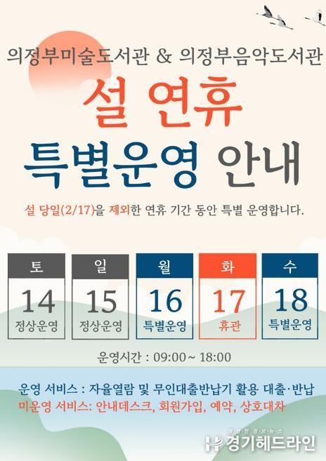 [경기헤드라인=문수철 기자] 의정부시는 2026년 설 명절을 맞아 시민과 귀성객들이 풍성한 연휴를 보낼 수 있도록 미술도서관과 음악도서관을 특별 운영한다.