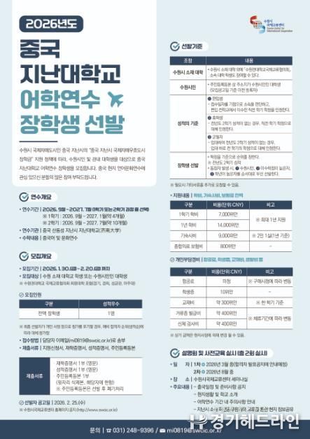 [경기헤드라인=문수철 기자] 수원특례시는 2월 20일까지 ‘2026년도 지난대학교 어학연수 장학생 프로그램’ 참가자 1명을 모집한다.