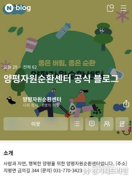 [경기헤드라인=문수철 기자] 양평군은 지난 12일 군민과의 소통을 강화하고 자원순환 정보 전달을 확대하기 위해 ‘양평자원순환센터 공식 블로그’를 개설·운영한다고 밝혔다.