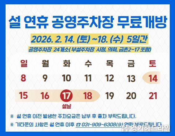 [경기헤드라인=김홍량 기자] 파주도시관광공사는 12일, 2026년 설 명절을 맞아 시민과 고향을 방문하는 귀성객의 교통편의를 위해 공영주차장 24곳(부설주차장 시청, 의회, 금촌2-17 포함)을 오는 14일(토)부터 18일(수)까지 5일간 무료로 개방한다고 밝혔다.