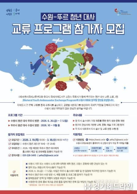 [경기헤드라인=문수철 기자] 수원시국제교류센터는 수원시의 국제자매도시인 프랑스 뚜르시와 추진하는 ‘2026 수원-뚜르 청년 대사 교류 프로그램’에 참여할 수원시 청년 2명을 3월 18일까지 모집한다.