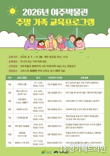 [경기헤드라인=정현수 기자] 여주시 여주박물관은 오는 3월 7일부터 11월 28일까지 매주 토요일, 가족 단위 관람객을 대상으로 한 ‘2026년 주말 가족 대상 교육프로그램’을 운영한다.