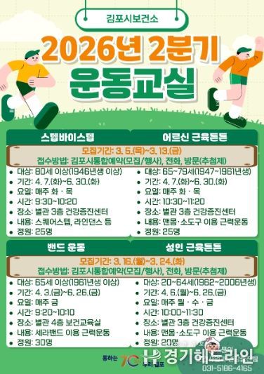 [경기헤드라인=문수철 기자] 김포시는 2026년 4월부터 6월까지 운영되는 2분기 운동 프로그램 참여자를 3월 5일부터 24일까지 모집한다.